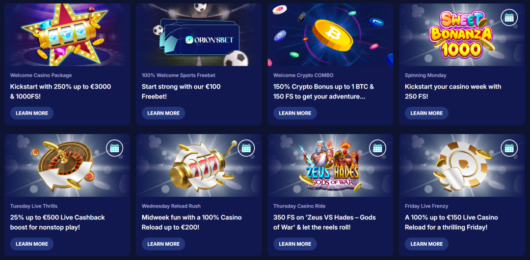 Regular promotions make OrionsBet appealing beyond the initial sign-up. Crypto users get their own boost — 150% up to 1 BTC plus 150 free spins. Like most casinos, there are terms to read through first: wagering rules, eligible games, time limits. It’s worth spending a few minutes checking those so you know exactly how the bonus works.